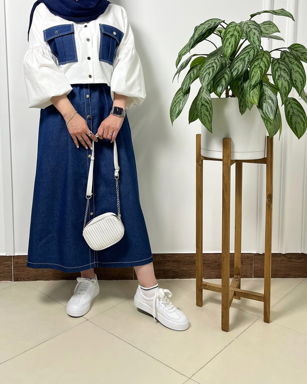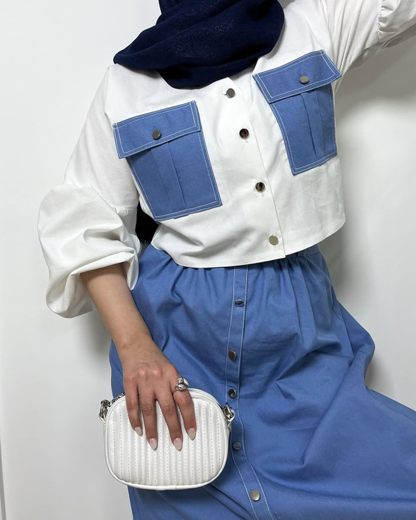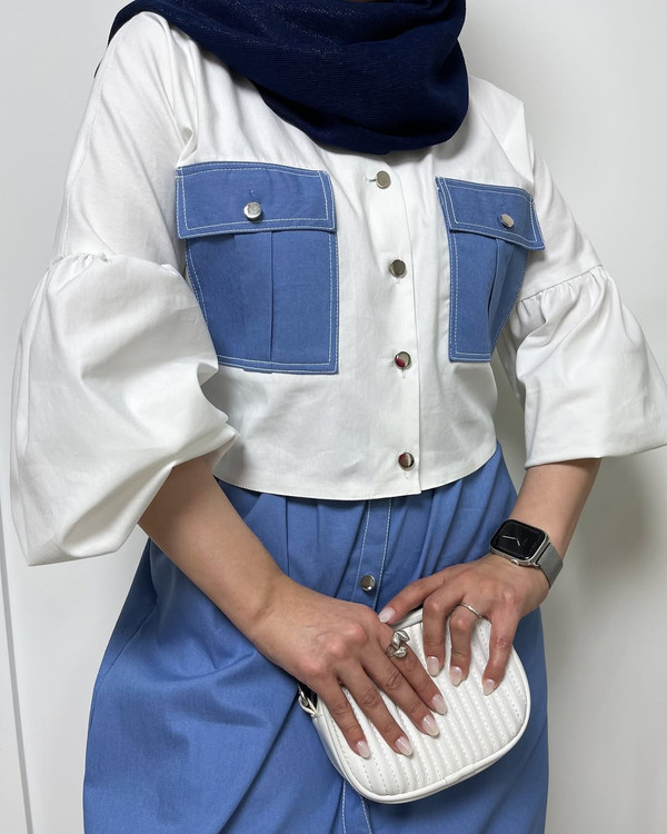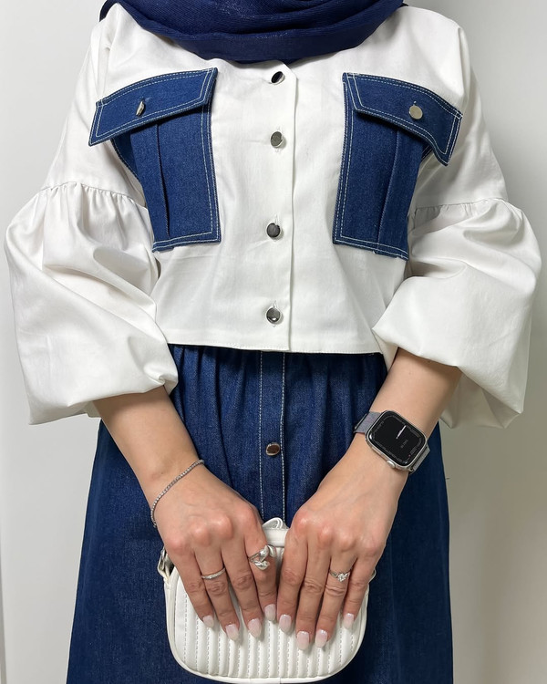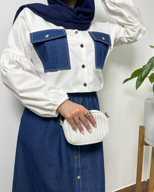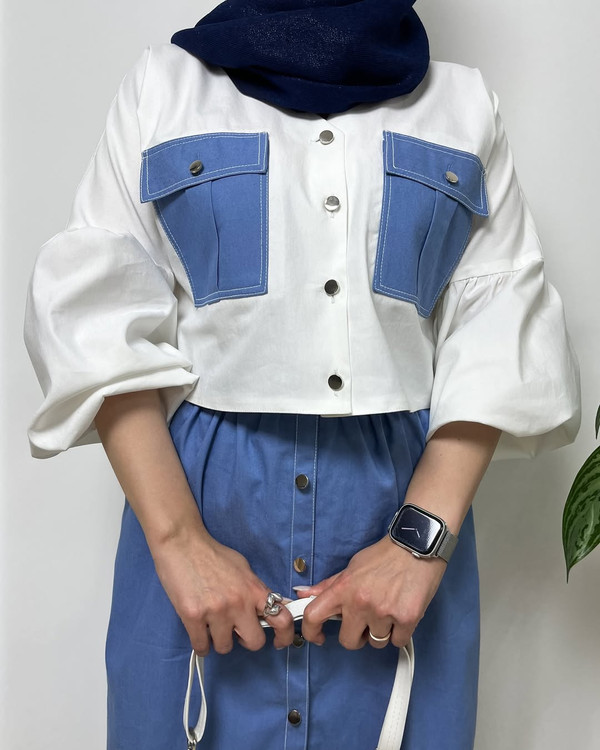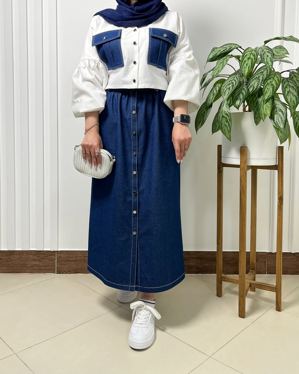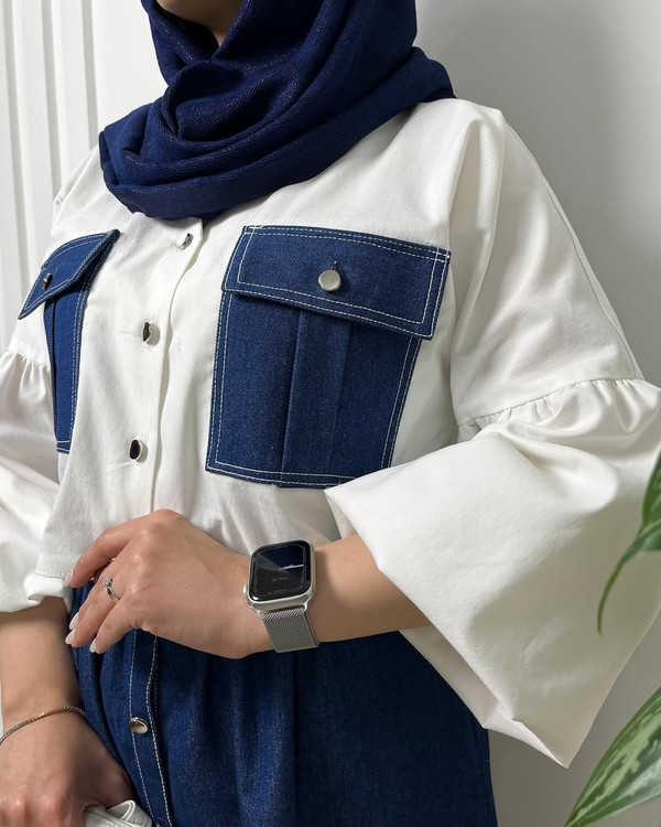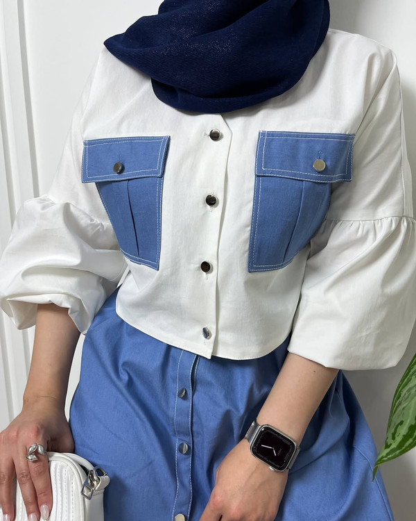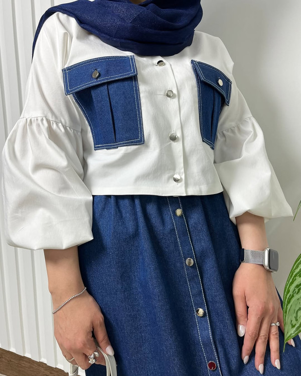 توضیحات : قابل سفارش با قد دلخواه، پارچه سفید شومیز بدننمایی ندارد، رنگدهی پارچه سفید و جین تست شده و مشکلی ندارد، شومیز یقه هفت