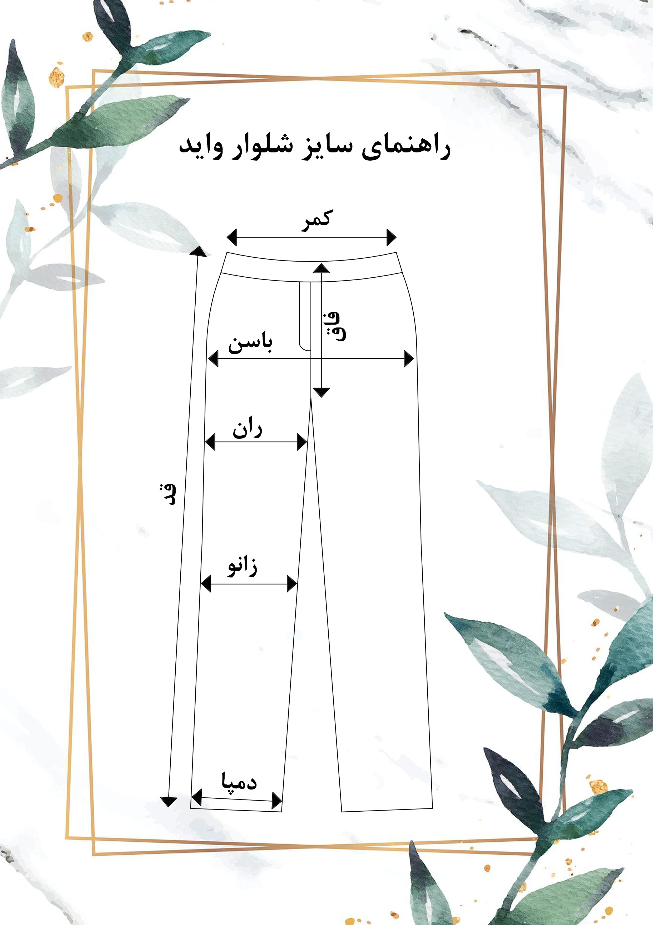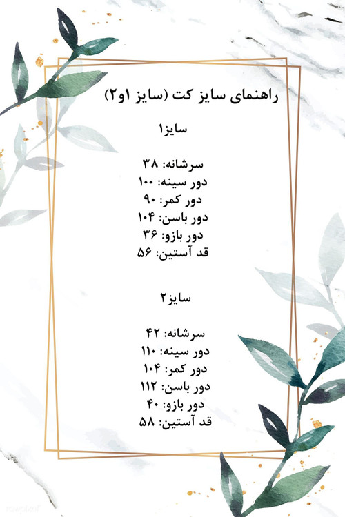 سایزبندی : کت فری سایز 1 و 2، شلوار واید دارای سایزبندی مطابق جدول راهنمای سایز